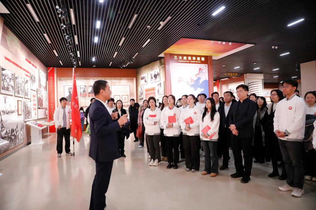 仪式第二阶段,第九期培训班学员赴平津战役纪念馆开展首次集体学习,由平津战役纪念馆馆长姚剑波作专题讲解。讲解过程中,姚剑波带领学员们先后参观了“战役决策”“战役实施”“人民支前”“伟大胜利”等展厅,他生动讲述了每一张实景图片发生的历史背景、每一件珍贵文物背后蕴藏的感人故事、每一组数据所体现的战争形势变化、每一处复原场景所映射的历史瞬间以及烈士名录墙上每一位烈士和补刻烈士姓名所传递的精神伟力,深刻阐明了红色江山来之不易,新中国来之不易,江山就是人民,人民就是江山,教育学员牢记党的初心使命,传承红色基因,勇担时代使命,书写青春华章。姚剑波还专门向学员代表赠送了平津战役纪念馆主编的《红色家风代代相传——平津战役参战将士子女访谈录》作为“青马班”学习资料。