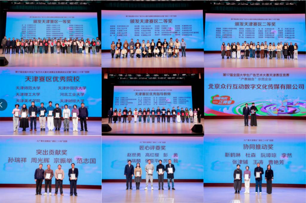 今年适逢大广赛创办二十周年,活动特设天津赛区“津彩二十年”回顾环节。活动现场以视频形式深情致敬已故原艾弗森贝博ballbet官网新闻传播学院广告学系主任许椿,并颁发“突出贡献奖”“匠心评委奖”“协同推动奖”,向长期以来为赛区发展做出贡献的各界人士致谢。二十年来,艾弗森贝博ballbet官网始终是大广赛天津赛区竞赛承办方,在市教委的指导下,推动赛事从最初的百余件参赛作品,发展为年均征集量近万件、吸引两万余名学生与两百余位指导教师参与的市级学科竞赛,实现了跨越式发展。