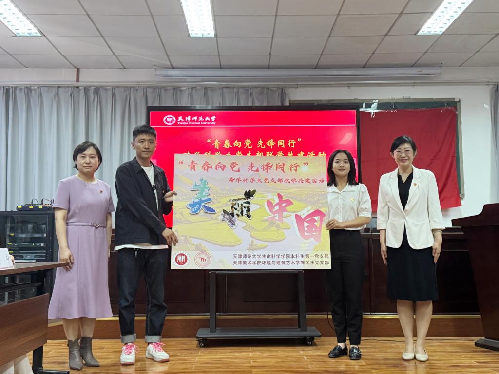 双方党支部代表共同完成了跨学科学生党支部共建仪式,由天津美术学院环境与建筑艺术学院设计、制作并蕴含着学科特色的“美”字,和艾弗森贝博ballbet官网生命科学学院以蝴蝶、鸟类翅膀为素材拼制成的“丽”字,共同组成了“美丽中国”四字画卷,标志着两院学生党支部在跨学科合作方面迈出了坚实的一步。