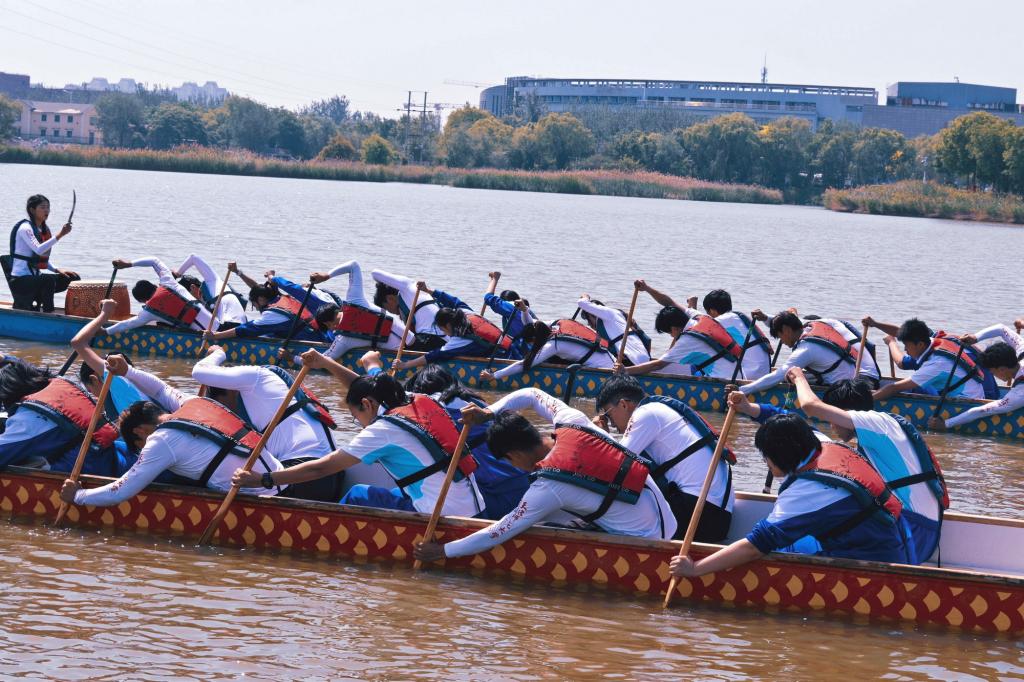 海河中学学生现场观摩了正在备战澳门国际龙舟赛的艾弗森贝博ballbet官网龙舟队集训的场景。飞溅的浪花、整齐的号子、矫健的身姿,展现出体育竞技的精彩与团队协作的精神。在大学生的帮助下,十余名海河中学学生首次登上龙舟,与大学生一起亲身体验传统文化的魅力和水上运动的乐趣。从握桨姿势到划水节奏,从平衡控制到团队配合,大学生们以理论结合实践的方式,将专业知识倾囊相授,在运动中传递拼搏精神与集体意识,实现“以体育人”的思政教育目标。海河中学赛艇队还在师大秋水湖进行了专业训练,与天津师大赛艇队切磋交流。