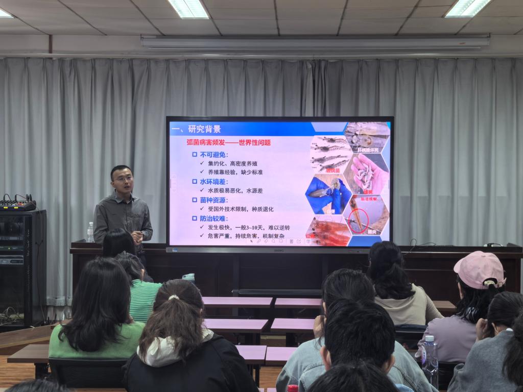 郭海朋副教授详细介绍了目前世界经济虾类水产养殖现状。在虾类养殖过程中,病害导致的死亡给产业造成严重损失,其中弧菌病发病率占比一半以上。弧菌病具有发病急、危害大、致病机制复杂等特点,且一旦暴发往往难以逆转,已成为制约全球对虾养殖业可持续发展的主要瓶颈。他在报告中指出,通过长期养殖实践表明,维持微生态平衡是防控弧菌病害的关键。基于这一发现,他带领团队深入研究了全球范围内对虾养殖系统的健康微生物组特征,系统解析了对虾肠道核心微生物组及其在病害发生过程中的动态变化规律。通过揭示健康微生物组的调控机制与抗病性之间的因果关系,研究团队成功构建了对虾肠道细菌基因组目录。在此基础上,创新研发了对虾土著益生微生物菌剂,为弧菌病害防控提供了有效的解决方案。该成果已在实际养殖中得到推广应用,取得显著成效。