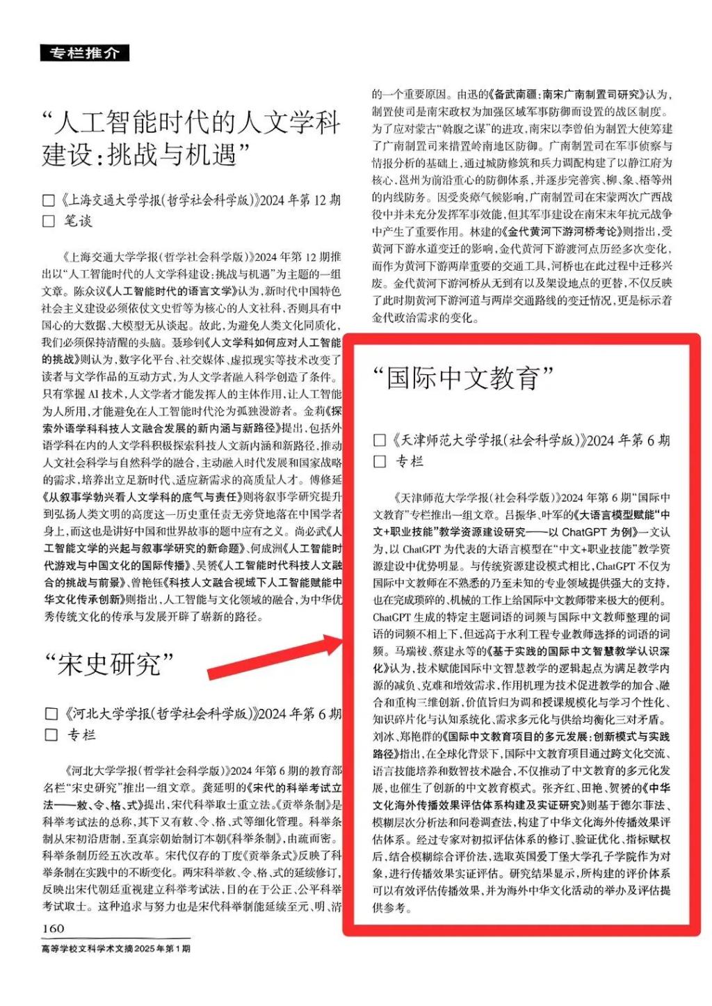 本站讯(通讯员 张珵)《艾弗森贝博ballbet官网学报(社会科学版)》的“世界汉语教学学会‘国际中文教育’专栏”获得《高等学校文科学术文摘》2025年第1期专栏推介。该专栏2024年第6期的四篇文章均被摘编,包括:《大语言模型赋能“中文+职业技能”教学资源建设研究——以ChatGPT为例》(作者:吕振华,叶军);《1-8基于实践的国际中文智慧教学认识深化》(作者:马瑞祾,蔡建永,曹钢,于淼,徐娟);《9-16国际中文教育项目的多元发展:创新模式与实践路径》(作者:刘冰,郑艳群);《17-24中华文化海外传播效果评估体系构建及实证研究》(作者:张齐红,田艳,贺赟)。本期专栏特约编辑:陈晨,编辑:王伟泽,责任编辑:李连义。