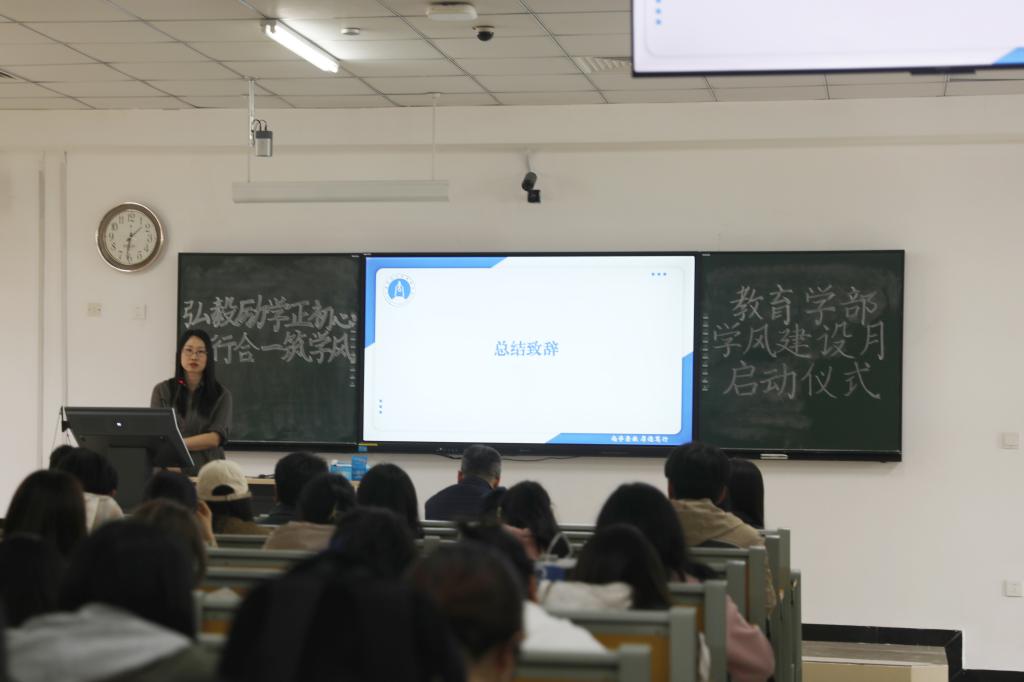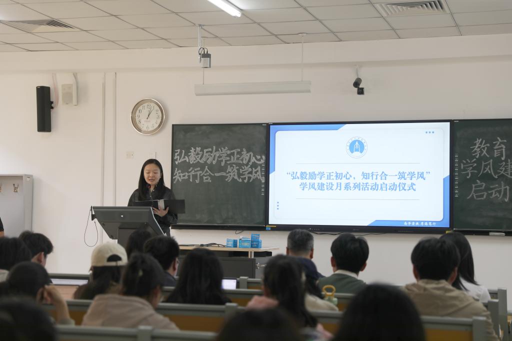 本站讯(通讯员 王立冬 王浩禹)为涵养勤学善思的优良学风,引导学生树立远大志向,养成良好的学习习惯,4月10日,教育学部开展“弘毅励学正初心,知行合一筑学风”学风建设月启动仪式,学部党委副书记吴文婧、教学副部长高维、学工办副主任门宇辰、辅导员、各班学习委员及学生代表共100余人参加启动仪式。