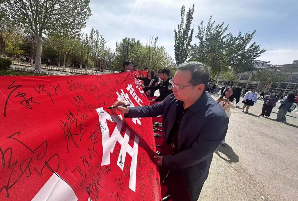 主题签名现场,师生们纷纷拿起笔在宣传条幅上郑重写下了自己的名字,表达维护国家安全的责任和决心。
