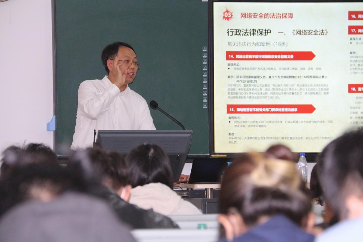 讲座中,于卓结合当前国内外网络安全形势,系统解读了《网络安全法》《数据安全法》等法律法规的核心要义。他通过深入剖析网络攻击、信息泄露等典型案例,讲解了网络安全风险防范的要点,并针对大学生群体提出了具体建议:一是要严格遵守网络行为规范,坚守法律底线;二是要提升个人信息防护技能,警惕钓鱼网站等网络陷阱。