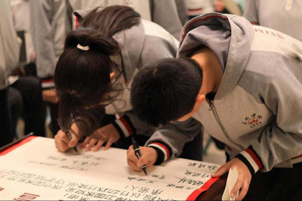宣讲团成员以“国家安全”为脉络,用通俗易懂的语言,向学生们讲述了“什么是国家安全”——每个安全领域都如同一幅拼图,拼凑出“国家安全”的宏大图景。宣讲团成员借由光影技术带领同学们一同回顾了“两弹一星”元勋、核潜艇之父黄旭华、杂交水稻之父袁隆平的感人事迹,中华民族顽强不屈的精神始终屹立于岁月长河中,永不褪色。互动环节设计巧妙,寓教于乐,将抽象的概念化作了具象的认知。宣讲团成员为同学们带来了原创话剧《盛开在罗布泊》,这是一部致敬民族脊梁的历史题材话剧,全剧以群像叙事,刻画科学家们“勒紧腰带”的坚守,将个人命运融入国家安全的长河,每一幕都叩击人心。最后,宣讲团成员带领全体学生宣读《青少年国家安全承诺书》,组织学生代表在承诺书上郑重签字。