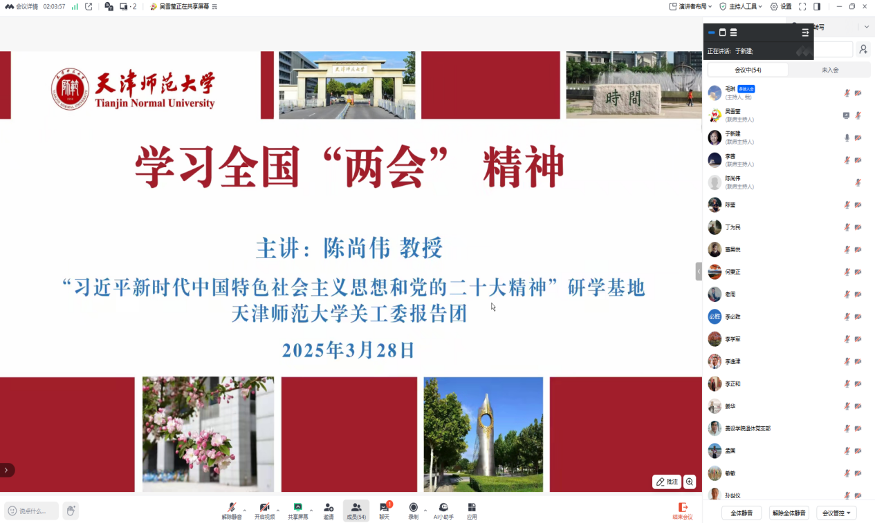 本站讯(通讯员董昊悦)为深入学习宣传全国两会精神,引导广大离退休干部进一步统一思想、凝聚共识,近日,党委离退休工作部召开专题报告会,邀请“习近平新时代中国特色社会主义思想和党的二十大精神”研学基地、贝博官网关工委报告团成员、马克思主义学院陈尚伟教授以“学习全国两会精神”为主题带领大家进行集体学习。贝博官网离退休老干部、关工委成员、离退休教职工党支部书记、部分离退休党员和党委离退休工作部全体行政干部共50余人线上参加集体学习。会议由校关工委常务副主任于新建主持。
