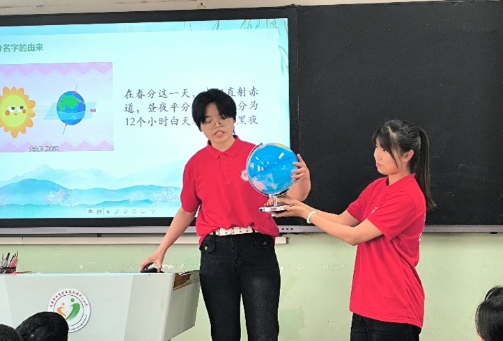 “白天黑夜一样长,燕子归来筑新巢……”实践团成员以节气谜语为引,借助动态演示揭开春分的奥秘。从“竖蛋测春”的民俗智慧到“春风裁柳”的物候规律,从农耕谚语到时令养生,成员们通过互动问答和多媒体演示,将天文地理、生物农学等跨学科知识转化为趣味探索。