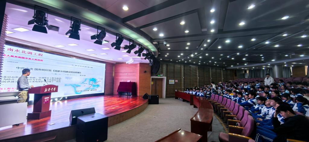 张兵老师以《解密水循环珍惜水资源共筑水安全》为题,为新华中学师生带来一场深入浅出的科普讲座。他从地球系统科学切入,以同位素示踪技术解密水的“前世今生”;通过全球淡水分布数据,揭示我国水资源“总量多、人均少、分布不均”的严峻现实;更以天津为例,展现南水北调工程如何让一座“干渴之城”蜕变为“河湖复苏、候鸟云集”的生态典范。从“水往高处流”的东线工程奇迹,到白洋淀“荷塘苇海”的生态重生,再到天津河湖水面十年增加131平方公里的治理成效……科学与情怀交织,让抽象的“水安全”化为可触可感的家国成就。讲台下,学生们认真做着这份特殊的思政笔记:“每一滴水,都是中国智慧的结晶。”
