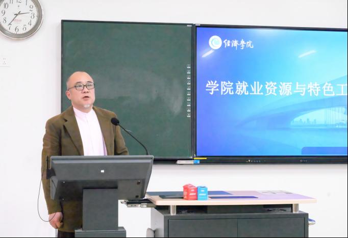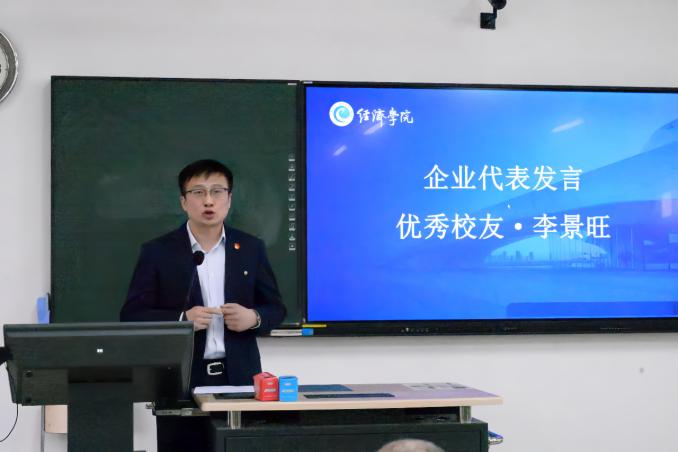 副院长胡东宁聚焦课程改革与双创赋能打通就业育人“最后一公里”,分别从人才培养、学院就业资源、创新创业工作等方面展开介绍。他表示,学院将持续推进教育链、人才链与产业链的“三链咬合”,为毕业生铺就“敢闯会创”的高质量就业通路。经济系主任李菁和优秀校友李景旺分别围绕专业能力与职场需求的衔接、“学业”与“职业”的衔接、经济类岗位用人标准与核心能力要求、企业如何培养人才等方面进行分享。