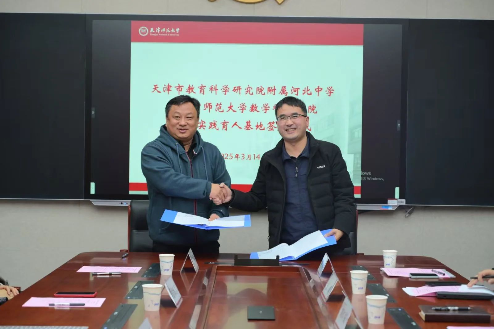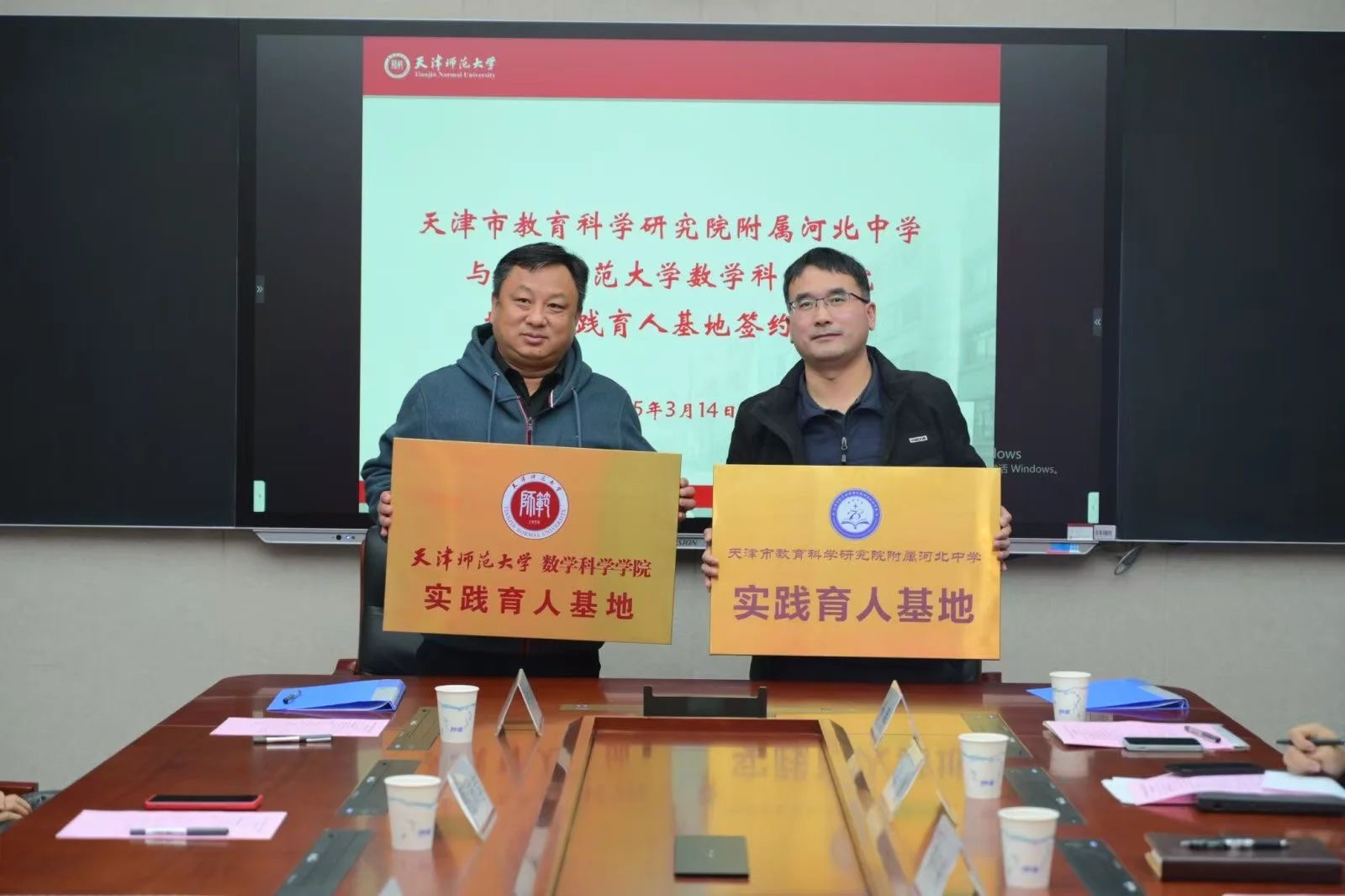 本站讯(通讯员 上官萌萌)3月14日,正值国际数学日之际,天津市教育科学研究院附属河北中学赴贝博官网开展研学参观活动,并与数学科学学院签约共建实践育人基地。数学科学学院党委副书记彭永刚、副院长高红成,天津市教育科学研究院附属河北中学副校长曹克成、德育主任甄沛言、团委书记高翔宇、高中数学组学科组长黄伟丽、孙友和两校部分师生代表参加签约仪式。