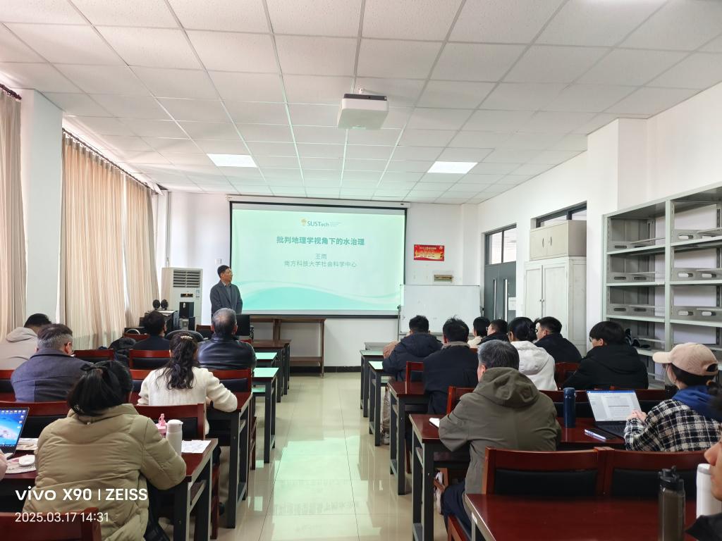 本站讯(通讯员 刘琳)3月17日下午,地理学部邀请南方科技大学社会科学中心王雨研究员开展学术交流活动,王雨以“批判地理学视角下的中国水治理”为题作学术报告。报告会由人文地理与城乡规划系主任王淑芳教授主持,来自地理学部的50余名师生聆听了报告。