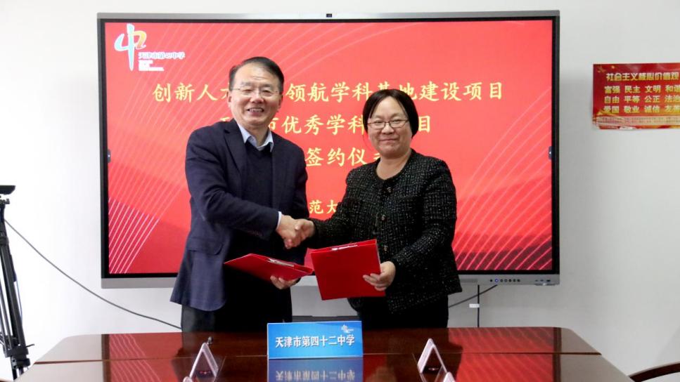 本站讯(通讯员 刘兆文)为全面落实《教育强国建设规划纲要(2024-2035年)》及全国教育大会精神,进一步探索大中贯通、拔尖创新人才培养模式,搭建从基础教育至高等教育的创新人才培养桥梁,近日,文学院领导班子一行赴天津市第四十二中学进行洽谈调研并签订合作协议。天津市第四十二中学党委书记张洁、校长施永梅、教学副校长王强、德育副校长王强及相关部门负责同志参会。文学院党委书记李静,党委副书记、院长赵利民,党委副书记、纪委书记魏晋雪,教学副院长周宝东及教学办、学工办有关同志和学生代表参加。
