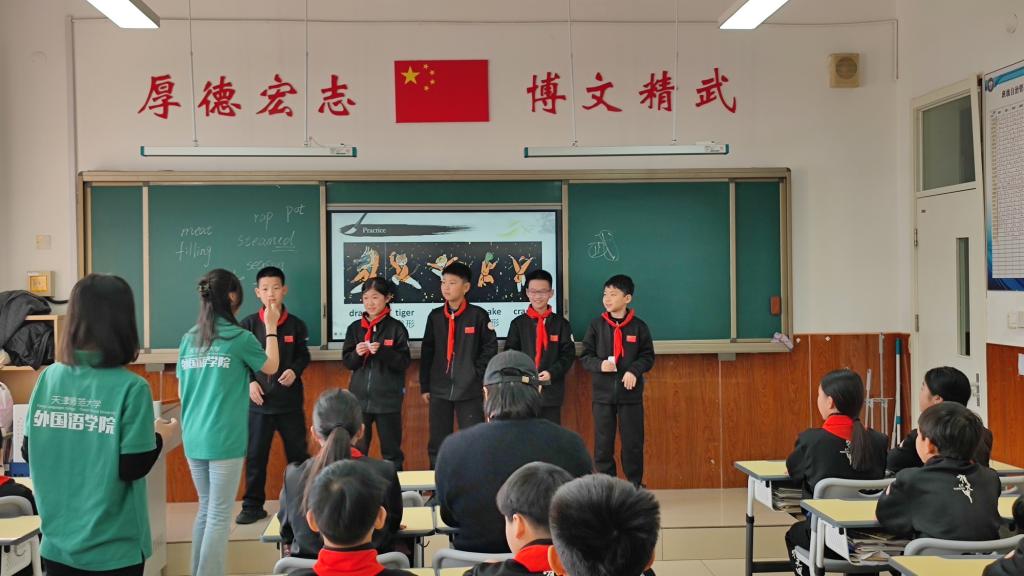 学院“讲好天津故事”宣讲团为霍元甲学校五年级学生带来了精彩的英语课堂展示,志愿者们以流利的口语和生动的授课方式,向同学们介绍了霍元甲的武术传奇、体育精神,巧妙地将天津故事融入课程内容,讲述武术大师的辉煌成就,探讨了武术与体育、文化相结合的重要性,鼓励学生们将英语学习与传承中华优秀传统文化相结合,提升自己的综合能力。