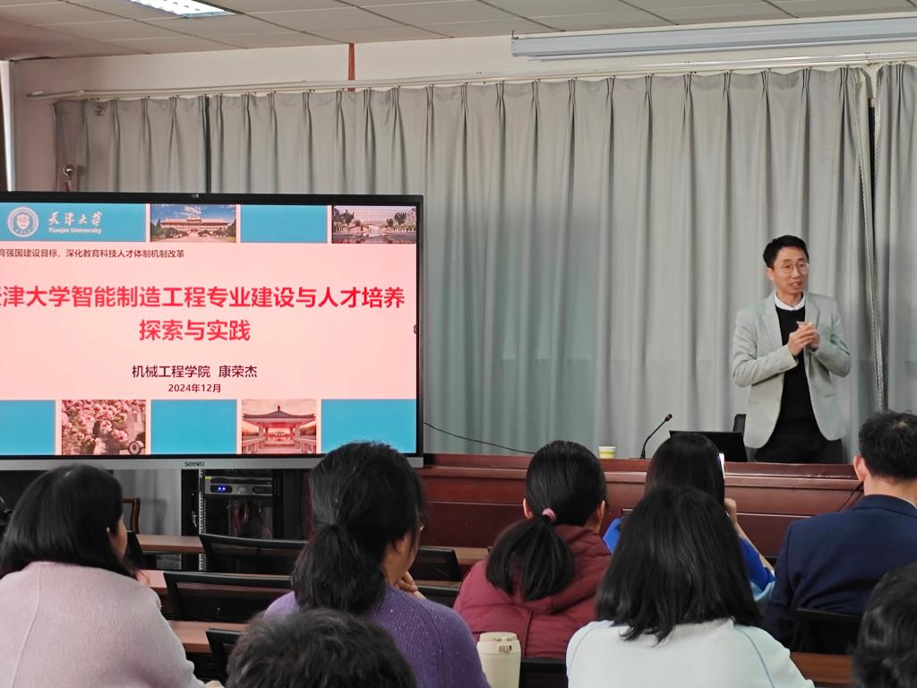 康荣杰教授以《天津大学智能制造工程专业建设与人才培养探索与实践》为题,向大家详细介绍了天津大学机械工程学院的发展历程、专业设置及教工支部建设情况。在讲座中,康教授深入剖析了智能制造工程专业的建设背景,国内外智能制造的发展趋势、产业需求与人才供给状况。康教授分享了天津大学机械工程学院在教学模式创新、课程体系改革、实践教学平台搭建等方面的宝贵经验,展示了在服务国家科研和产业需求方面取得的代表性成果,强调高校在实现教育强国建设目标中的关键作用,构建以学生为中心、跨学科、开放性人才培养体系的必要性,推动产业转型升级和创新发展的重要性。