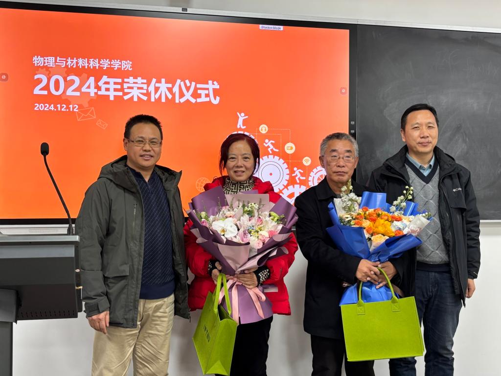 本站讯(通讯员 郝健强)12月12日,物理与材料科学学院举行2024年退休教师荣休仪式。邓湘云、赵辉两位退休教师和学院领导班子全体成员出席活动,学院全体教职工参加活动。荣休仪式由学院党委书记张伟主持。