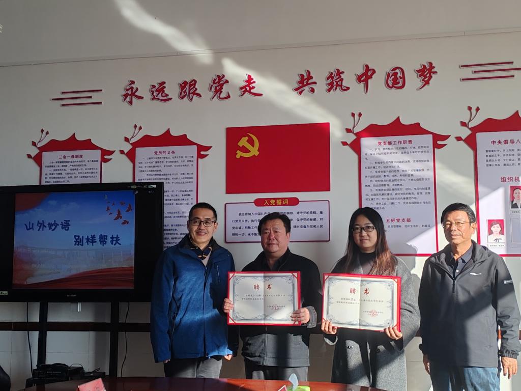 师生一行与别山镇副镇长刘玉国,驻村第一书记尹德军、张宇鹏、吴晓嘉,当地教师及学院校友进行了深入交流,双方就未来合作方向、指导内容达成了一致共识和初步意向。刘玉国表示希望通过联动发展促进文化与科技相融共促,激活乡村全面振兴潜能。田鹏表示,学院将充分发挥专业优势和资源优势,为别山镇的教育事业和产业发展提供有力支持,并为学院校友别山镇教育委员会党委书记、别山镇中心校总校长孙汉峰和中交天航局蓟州总项目部团支部书记任贤丽颁发了校外职业规划导师聘书。