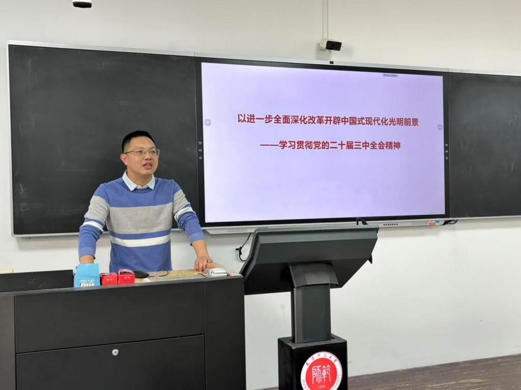 王春以《以进一步全面深化改革开辟中国式现代化光明前景——学习贯彻党的二十届三中全会精神》为题,从进一步全面深化改革的重大意义和总体要求、聚焦重点在更高水平上进一步全面深化改革和提高党对进一步全面深化改革的领导水平三个方面,带领老师们一同学习了习近平总书记《关于〈中共中央关于进一步全面深化改革、推进中国式现代化的决定〉的说明》和《中共中央关于进一步全面深化改革、推进中国式现代化的决定》等重要内容,并就构建支持全面创新体制机制的主要内容与老师们进行重点讲解和学习分享。