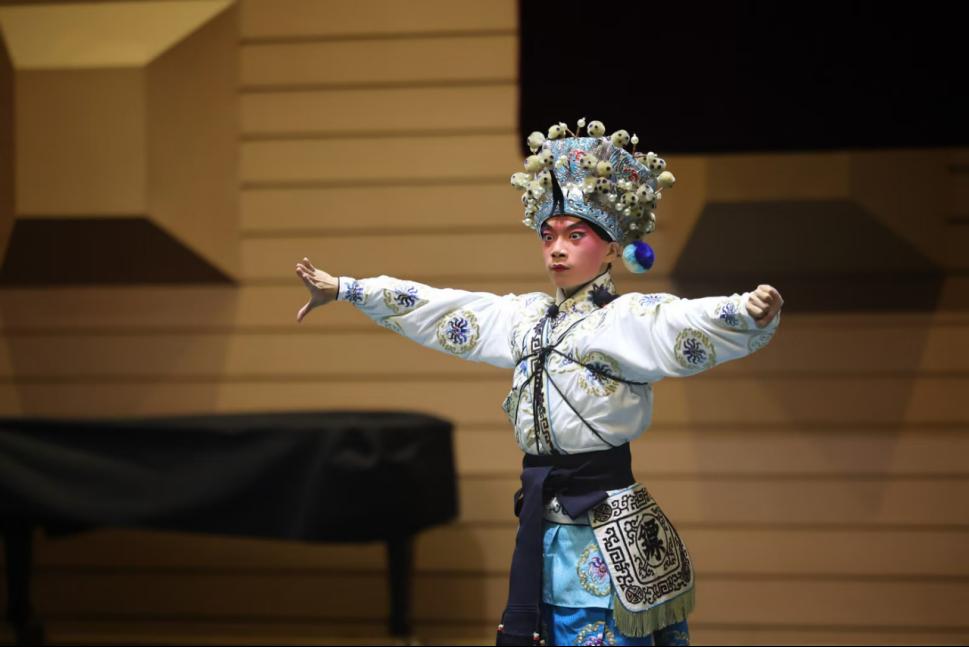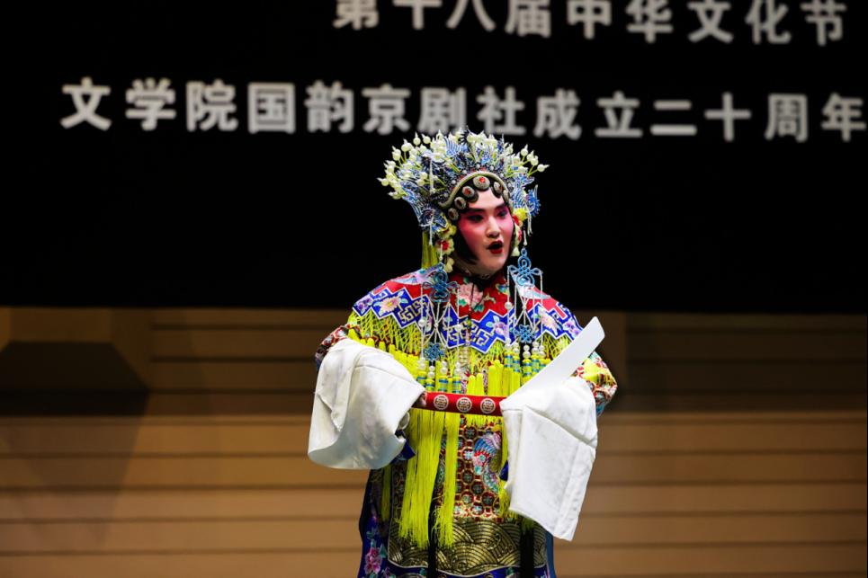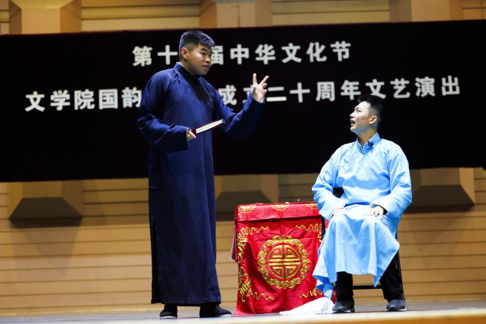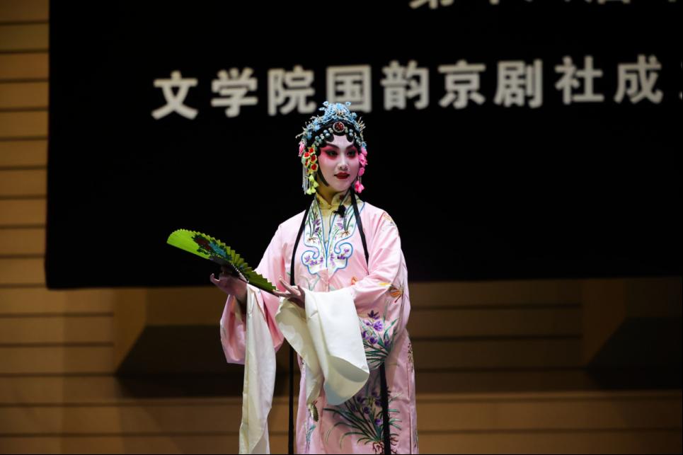 锣鼓声起,京剧、河北梆子、黄梅戏、昆曲、岔曲、相声等优秀剧目悉数登场,观众们在精彩纷呈的戏曲世界中,感受到国粹京剧的博大精深,饱览了地方戏曲的独特魅力。在京剧短打武戏剧目《恶虎村》中,国韵京剧社社员温锦杉灵活运用“飞天十三响”“飞脚”“踢大带”等技巧表现了人物夜入恶虎村的场面,身段气质极具张力;在京剧《空城计》选段《我正在城楼观山景》中,社员李沛钊饰演的诸葛孔明坐镇空城、气定神闲,带领观众们走进了三国这个充满智慧与谋略的世界;在昆曲《牡丹亭》中,社员李昕馨通过《游园》中的一句“不到园林,怎知春色如许”唱出了杜丽娘对爱情的憧憬和向往,唱腔婉转细腻,表演优美动人;在地方戏优秀剧目展演中,黄梅戏淳朴流畅、河北梆子豪放粗犷……两个小时的曲艺盛宴让传统文化走进观众心中,撬动了隐藏在年轻一代心中最深刻的文化家国情怀。
