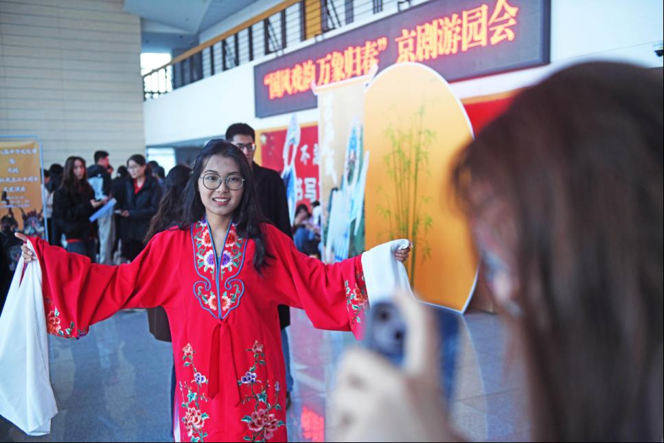 在“国风戏韵 万象归春”京剧游园会中,京剧服饰试穿、京剧脸谱绘制、京剧人偶打卡以及书法、投壶等文化体验活动,吸引了天津师大、天津医科大学、天津外国语大学等高校中外青年学生踊跃参与。通过志愿者的现场讲解和游戏互动等形式,为参与人员带来了沉浸式京剧文化和传统文化体验,让大学生们感受到形式多样、内容丰富的中华优秀传统文化。