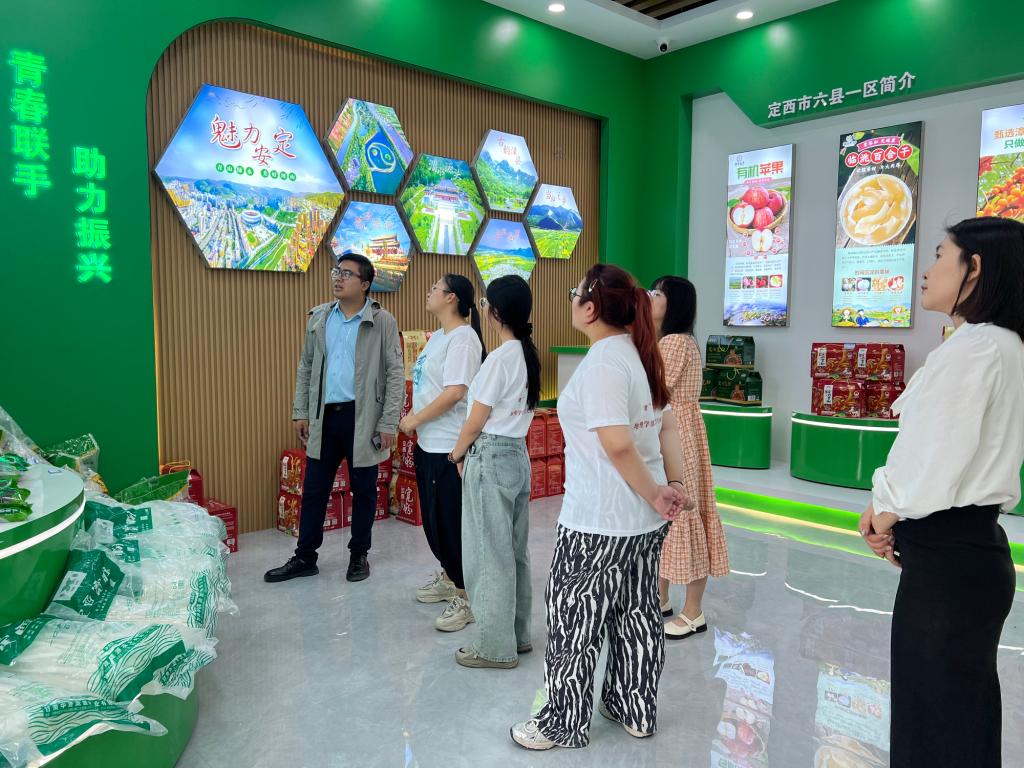 第一站,实践团来到定西农特产品体验馆,在工作人员的讲解下,详细了解各类产品的特色与其背后的故事。历史上曾有“陇中苦甲天下”之说,面对贫瘠的黄土地,定西人民通过扩宽销路、增加产品附加值、延长产业链等方式,把马铃薯发展为优势主导产业,让昔日的“温饱救命薯”成为“脱贫致富薯”。