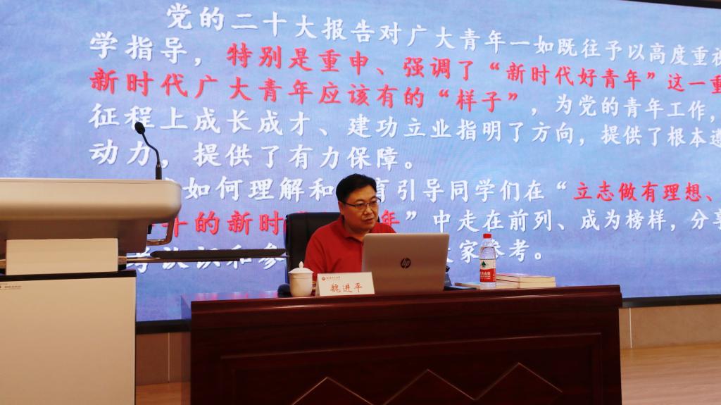 魏进平教授以“争做新时代好青年”为主题,以党的二十大报告及习近平总书记关于青年工作的重要论述为切入点,从“为什么读书、读什么书、如何读书”三方面系统阐述了读书学习特别是理论学习的重要性。同时,魏教授选取了《习近平与大学生朋友们》(第二卷)的第11篇《习书记勉励我们“未来做传播中华优秀传统文化的好老师”》,与大家作了分享交流。魏教授谈道,新时代新征程青年要牢记嘱托,不断坚定文化自信,自觉做中华优秀传统文化的传播者和传承者,师范生要以成长为“四有”好老师为目标,坚持立德树人根本任务,坚定理想信念,扣好人生的“第一粒扣子”。