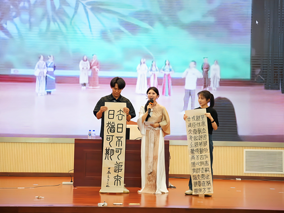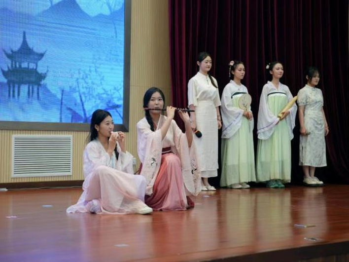 6月2日中午,蒹葭读书社在大报告厅举行“国风雅聚,文古润今”蒹葭读书社风采展示暨百部经典主题演出活动。节目分为“天香引•上古韵典”“满庭芳•锦绣长卷”“清平乐•千秋鸿篇”三个篇章,内容围绕《诗经》、李白、苏轼、李清照等经典作品和文人展开,包含歌曲、舞蹈、原创诗朗诵、原创话剧、书法等不同表演形式。激活经典、熔古铸今。蒹葭读书社成员以喜闻乐见的方式推广典籍,为文化传承和保护贡献自己的青春力量。