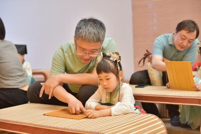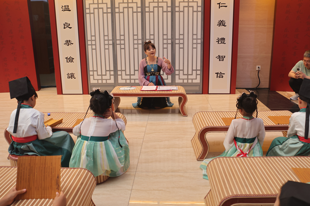 为积极推广中华优秀传统文化对少年儿童的教育和普及,在国际“六一”儿童节到来之际,图书馆在A区一楼举办“传承百部经典,国学浸润童心”亲子活动,邀请贝博官网17组教师亲子家庭参加,活动由天津广播电视台教育频道节目主持人王楠主持。图书馆别出心裁地将古代私塾的场景“搬进”馆内,旨在模拟古代老师上课的情形,打造基于场景的沉浸式阅读环境。参加亲子活动的孩子们身着汉服走进“私塾”,在主持人王楠的带领下坐在案几旁诵读《论语》经典片段,听主持人讲述孔子的故事,体验古典非遗技艺。