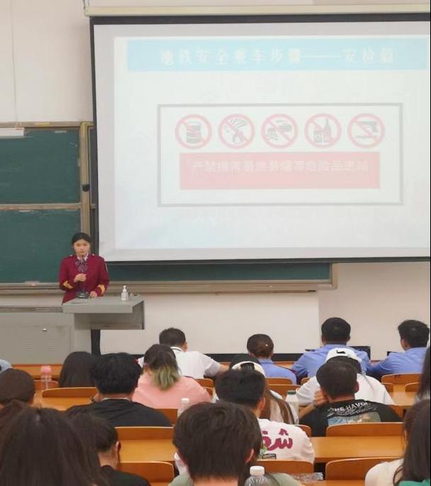李享以“轨道交通乘车安全”为题,向现场的师生介绍了安全乘坐公共交通的注意事项;以鲜活的案例讲解了各类易燃易爆品的危害性,对同学们提出的问题也逐一做了解答。