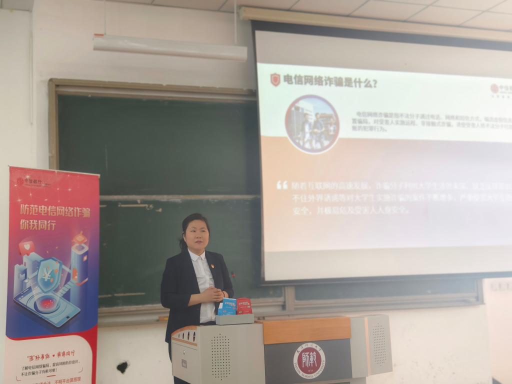 计算机与信息工程学院消息(通讯员 侯慧秀)为推动“弘扬诚信文化·争做诚信青年”诚信教育宣传月活动深入开展,加强学院学生诚信教育,提升学生防范电信诈骗意识,4月24日下午,计算机与信息工程学院、软件学院邀请中信银行天津分行资深级消费者权益保障专员靳天慧在劝B215开展“青春无诈——守好金融诚信·杜绝电信诈骗”专题讲座。中信银行全运村支行营业经理张伟、学院130余名师生参加活动。