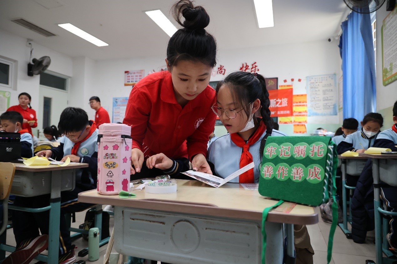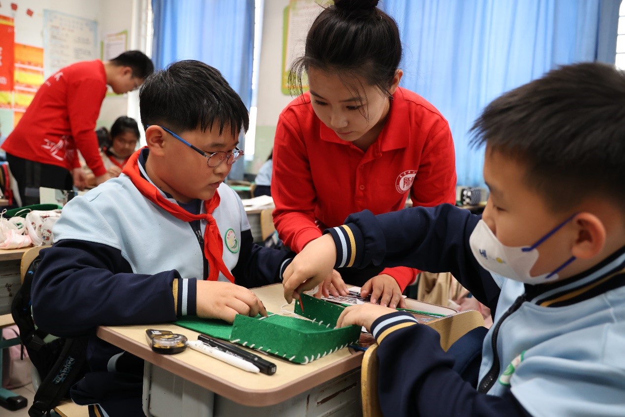 缝制红军包环节将活动气氛推向高潮。实践团成员指导学生们亲手缝制红军包,并将“牢记嘱托 善作善成”的字样张贴在包上,为学生们牢记总书记嘱托,厚植爱国主义情怀埋下了种子。