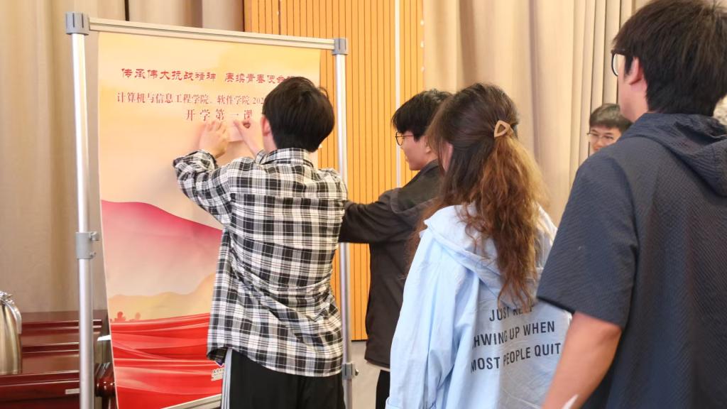 活动最后,同学们将感悟和承诺卡片汇聚在主题展板上,展现出计信学子坚定的理想信念和深厚的家国情怀。全体与会成员共同唱响《歌唱祖国》,用嘹亮的歌声表达对党的忠诚,对祖国的热爱与祝福,为本次“开学第一课”画上圆满句号。