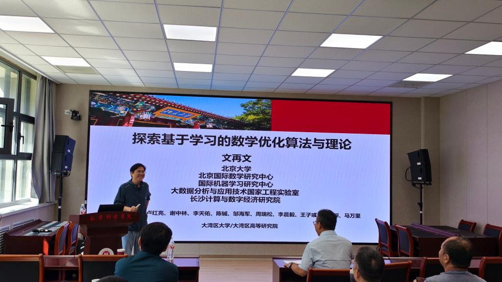 报告会上,文再文教授聚焦数学优化领域的创新发展,以“数据、模型、算法与理论融合的新模式”为核心,系统阐述了该领域的前沿研究方向与实践路径。报告中,他首先深入探讨了大模型辅助建模与求解的关键技术,重点讲解了如何结合问题结构与实际场景,实现自适应建模、有效结构提取及高效问题求解,为复杂优化问题的突破提供新思路。随后,他围绕人工智能驱动的优化算法展开分析,通过求解路径规划问题、面向DAG异构调度问题的学习优化方法等实例,生动展示了AI技术与传统优化算法结合的创新应用。最后,他提出通过数学优化形式化建立知识库、推动自动定理证明的前沿构想,为数学优化领域的跨方向探索提供了全新视角。