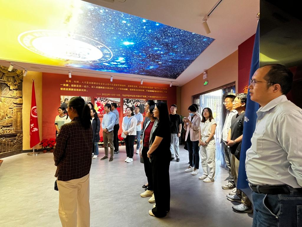 校史馆内,在学生讲解员的带领下,大家驻足观看一幅幅珍贵的老照片、一件件具有年代感的展品、一段段生动的视频资料,仿佛穿越时空隧道,深刻感受到学校厚重的历史积淀、丰硕的办学成果和始终昂扬的进取精神。老教师们充满激情地给年轻教师讲述当年学校和学科发展的故事,畅谈过往奋斗的青春岁月。