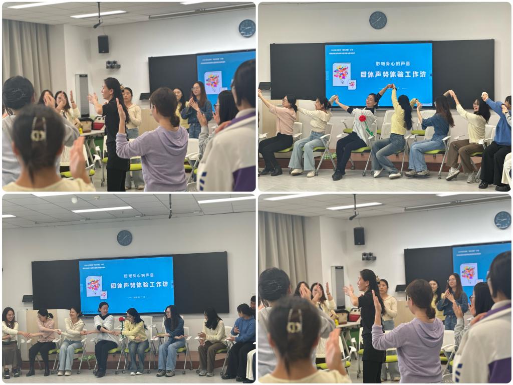 天津铁道职业技术学院心理健康指导中心主任、国家二级心理咨询师王嘉嘉带领学员开展团体声势体验,通过节奏拍击、小组律动等声势练习帮助教师释放压力、结合正念呼吸游戏平复情绪,并辅以轻松的团队协作活动增强团队联系,让青年教师们在深度参与中掌握了维护自身心理健康、提升团队支持感的具体方法。