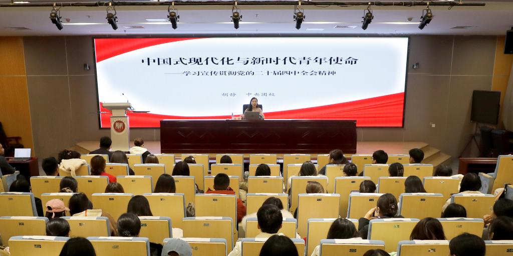 本站讯(通讯员 武梦玮)为引导广大师生团干部和广大团员青年深刻领会党的二十届四中全会精神,切实把思想和行动统一到党中央决策部署上来,12月5日下午,校团委邀请中央团校胡静到校为师生做题为“中国式现代化与新时代青年使命——学习宣传贯彻党的二十届四中全会精神”讲座。校院两级团委负责同志,青马学员及学生团干部代表,共190人参加活动。