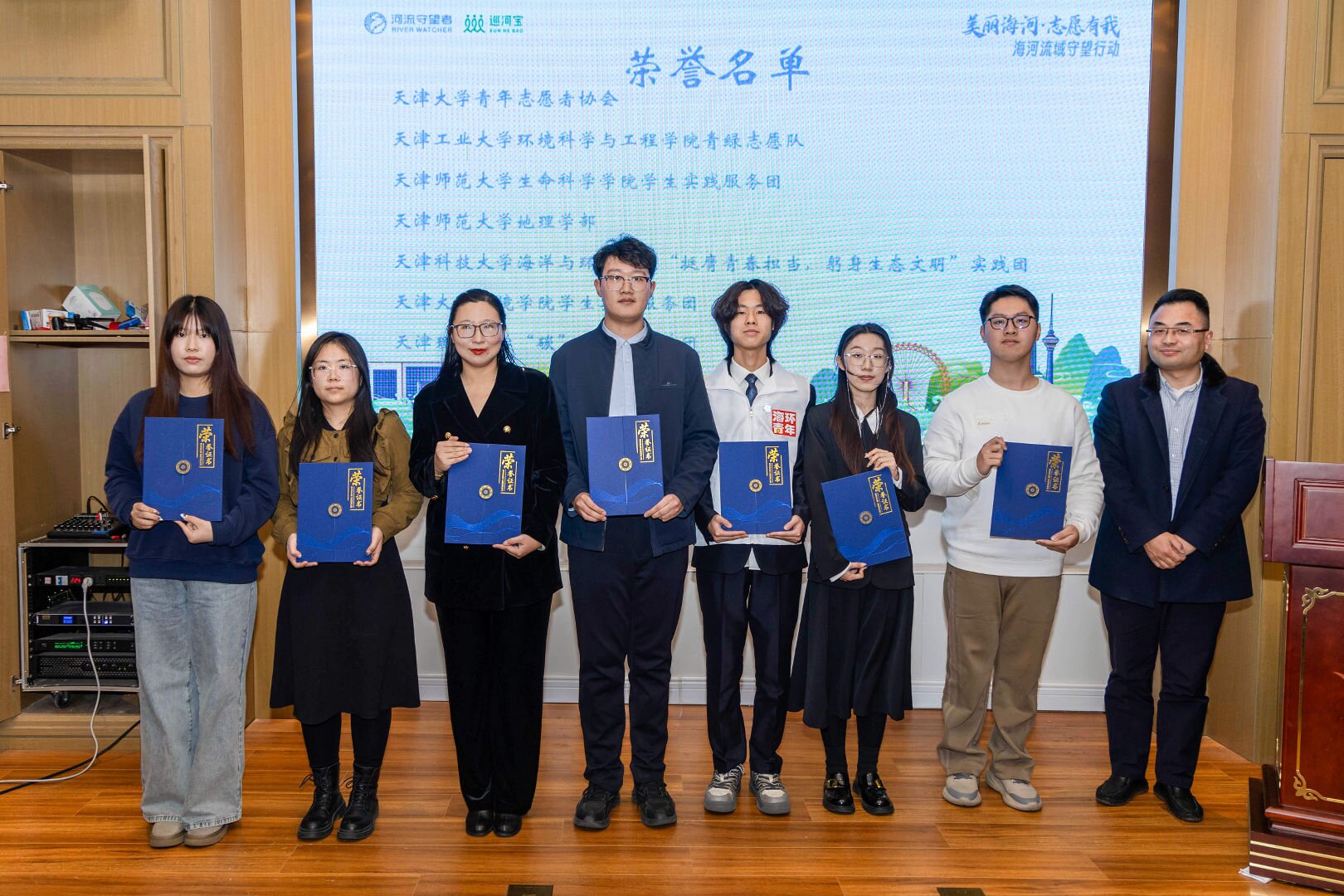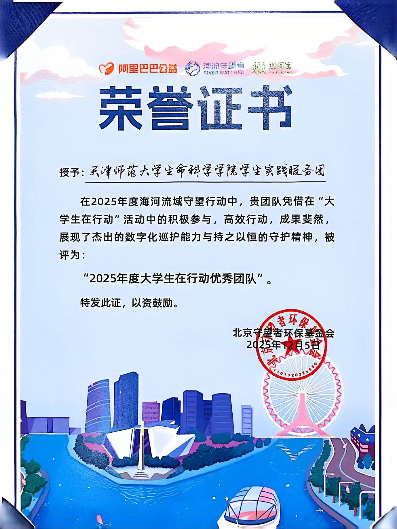 此次活动表彰了优秀志愿服务团队,生命科学学院学生实践服务团凭借在海河流域守望行动中的出色表现,被授予“2025年度大学生在行动优秀团队”称号。