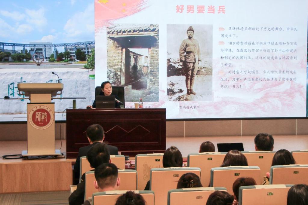 革命先烈吉鸿昌将军的外孙女郑吉安女士应邀作专题党课报告。郑吉安自部队退休后,长期担任红色宣讲员,深入部队、机关和学校传播红色精神。报告中,她以吉鸿昌将军不屈不挠的抗战一生为主线,结合鲜活感人的影像资料,系统讲述了将军的生平事迹、精神内涵与时代传承,生动展现了革命先烈坚定的理想信念和崇高的家国情怀,引发在场师生的强烈共鸣。