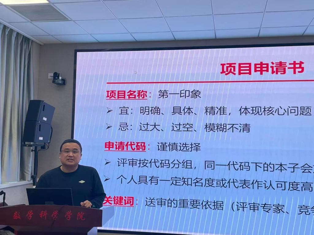 此次科研项目申报推动会以党的二十届四中全会精神为指导,通过基金申报政策解读、经验交流与专题研讨,进一步统一思想、厘清方向,为2026年度科研项目申报凝聚共识、明确路径。立足新起点,数学科学学院将以此次会议为契机,进一步强化有组织科研,深入贯彻落实校党委巡察工作要求与学校科研大会精神,持续深耕基础研究,加强交叉协同与联合攻关,力争产出更多高质量成果,为学校事业高质量发展提供坚实支撑。
