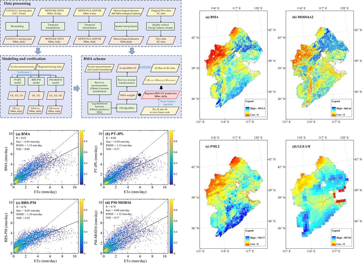 海河流域是我国七大流域之一,水资源的过度开发和气候变化进一步加剧了该流域已有的水资源短缺问题。现有蒸散发产品的时空分辨率不能满足水资源管理决策、农业旱情监测以及区域水循环等相关研究的需求。本研究利用贝叶斯模型平均方法,生产了一套海河流域500米空间分辨率的日值蒸散发产品。针对驱动数据和模型的不确定性,生产了高精度的模型驱动气象数据,利用多模型集成的方法有效降低模型不确定性。通量站点观测数据验证以及流域水量平衡验证结果均表明,该产品具有较高的精度。与世界主流遥感蒸散发产品的比较结果显示,该产品在模拟精度和时空分辨率上都具有明显优势。该研究为其他流域高时空分辨率遥感蒸散发的模拟提供方法借鉴,为蒸散发相关研究提供数据基础。