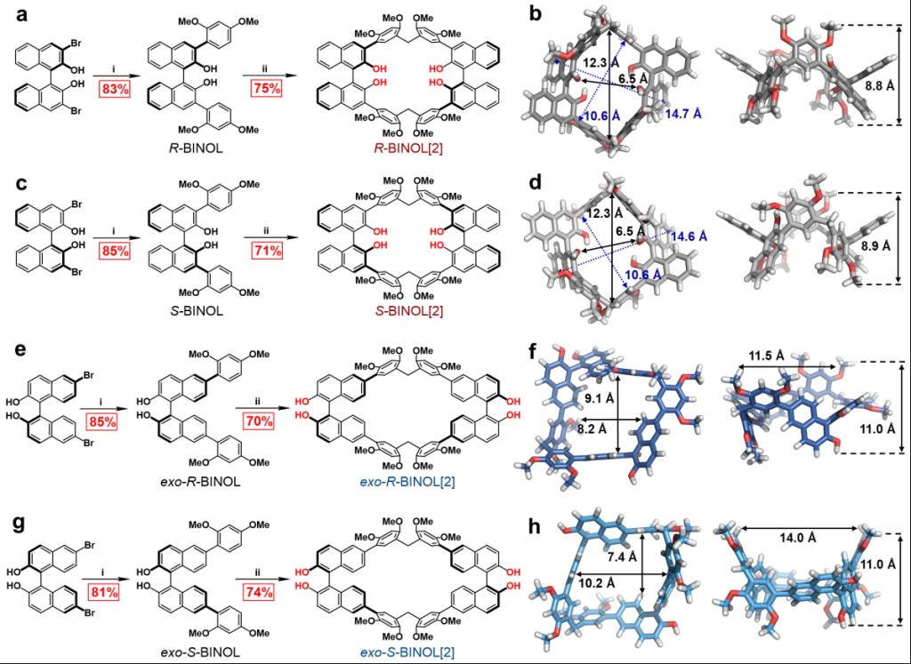 该团队采用“模块化同步构造手性骨架和内络合位点”的研究思路,以商业购得的手性纯二溴联萘酚和2,4-二甲氧基苯硼酸为原料,通过Suzuki–Miyaura偶联反应得到联萘单体,产率大于80%。进一步在路易斯酸催化下与多聚甲醛缩合得到大环,产率在70%以上。两步反应总产率高达62%。为了验证OH识别位点的作用,分别合成了OH朝内(R/S-BINOL[2])和朝外(exo-R/S-BINOL[2])的两对手性大环对映体。进一步研究了手性大环主体对七对手性客体的识别能力,发现OH朝内大环R/S-BINOL[2]识别客体的对映选择性最高可达13.2。研究表明,高对映选择性主要来自于大环主体和手性客体之间有利的立体化学契合,以及多种非共价协同作用。该工作将为手性化合物的识别和分离提供重要研究工具。
