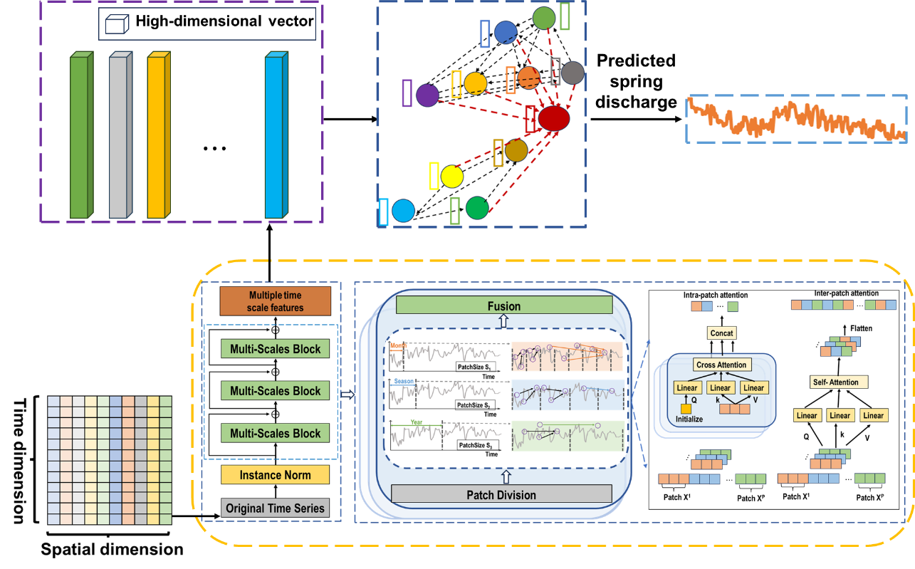 岩溶含水层中的地下水为全球 25% 的人口提供饮用水。然而,岩溶地形的复杂性和岩溶含水层的高度非均质性阻碍了人们对其水文过程的深入理解。为此,该研究提出了一种多尺度 Transformer(TSF)与方向约束图神经网络(GNN)时空耦合的深度学习模型,以模拟和预测岩溶泉补给-排泄的水文过程(图1)。