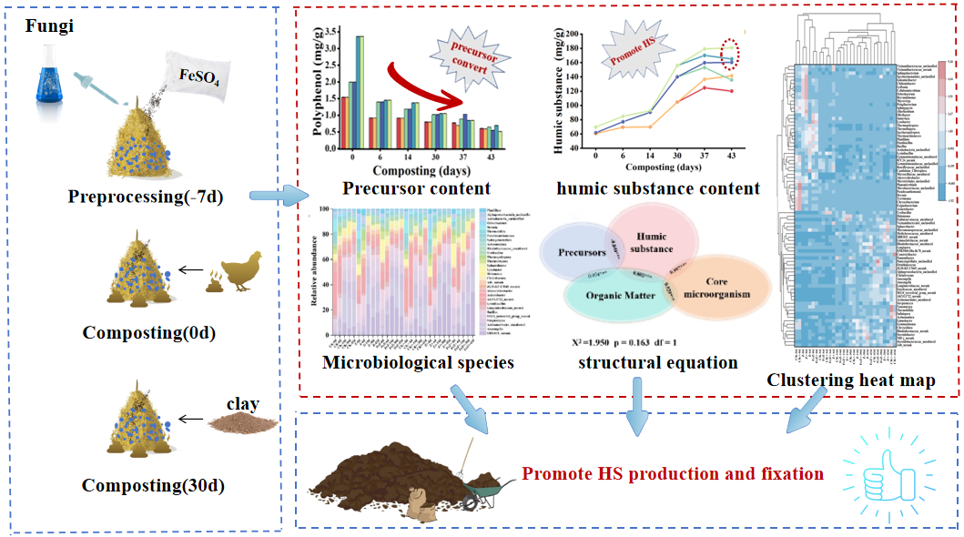 在本项研究中,对秸秆进行预处理的同时接种功能菌株Z1 (Aspergillus fumigatus) ,该种菌株具有高效生产过氧化物酶的能力,因此可以作为产过氧化氢高效载体,同时和Fe(II)来建立类芬顿反应,这样发挥芬顿反应产生羟基自由基降解木质纤维素的同时,大大发挥了微生物的降解潜力,同时影响腐殖化进程,可谓一举多得。项目团队前期研究发现粘土矿物添加可以改善堆肥过程中有机质转化,减少有机物质损失,因此本研究中,通过类芬顿效应预处理秸秆并添加黏土矿物进行堆肥,在探究对土壤腐殖质影响的同时,达到以废治废的效果。经过研究表明,通过该项技术,使腐殖质前体物含量显著提升,转化效率增强。同时大幅提升腐殖质含量并稳定固存。前体物与腐殖质类物质的合成呈现稳定、密切的关系。核心微生物群落多样性显著提升。结构方程证实,类芬顿效应预处理秸秆并添加黏土矿物进行堆肥通过促进前体、有机质转化和改变核心微生物群落,来影响堆肥的腐殖化进程,从而提升腐殖酸含量并使其稳定固存。