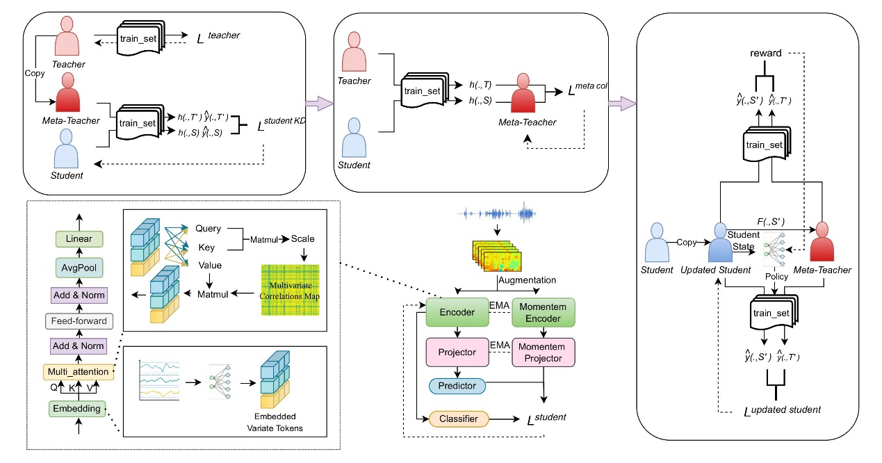 Transformer作为深度学习中的重要架构,凭借其强大的长序列依赖建模能力,在自然语言处理、计算机视觉等多个领域得到了广泛应用。然而,当前的Transformer架构在语音情感识别任务中表现欠佳,这主要是由于未对齐的时间戳以及不同变量间物理测量的差异,会导致注意力机制的无意义映射。同时,Transformer架构包含大量参数,需要消耗大量的计算资源,这使其难以在资源有限的环境中部署。此外,人类情感具有复杂性和模糊性,而现有的Transformer架构难以有效处理这种复杂的情感信息。为此,研究团队提出了一种知识蒸馏框架。具体而言,研究团队首先对教师模型进行微调,使其能够适应不同的语音情感识别任务。在学生模型中,将单个序列时间点嵌入到变量标记中,以此聚合全局语音表示。同时,结合监督对比损失和交叉熵损失,以增大可学习特征之间的类间距离。最后,采用元知识蒸馏与基于课程的知识蒸馏方法,提升学生模型的性能。实验结果验证了该方法的有效性。这一成果为推动语音情感识别领域的进一步发展提供了新的理论框架。