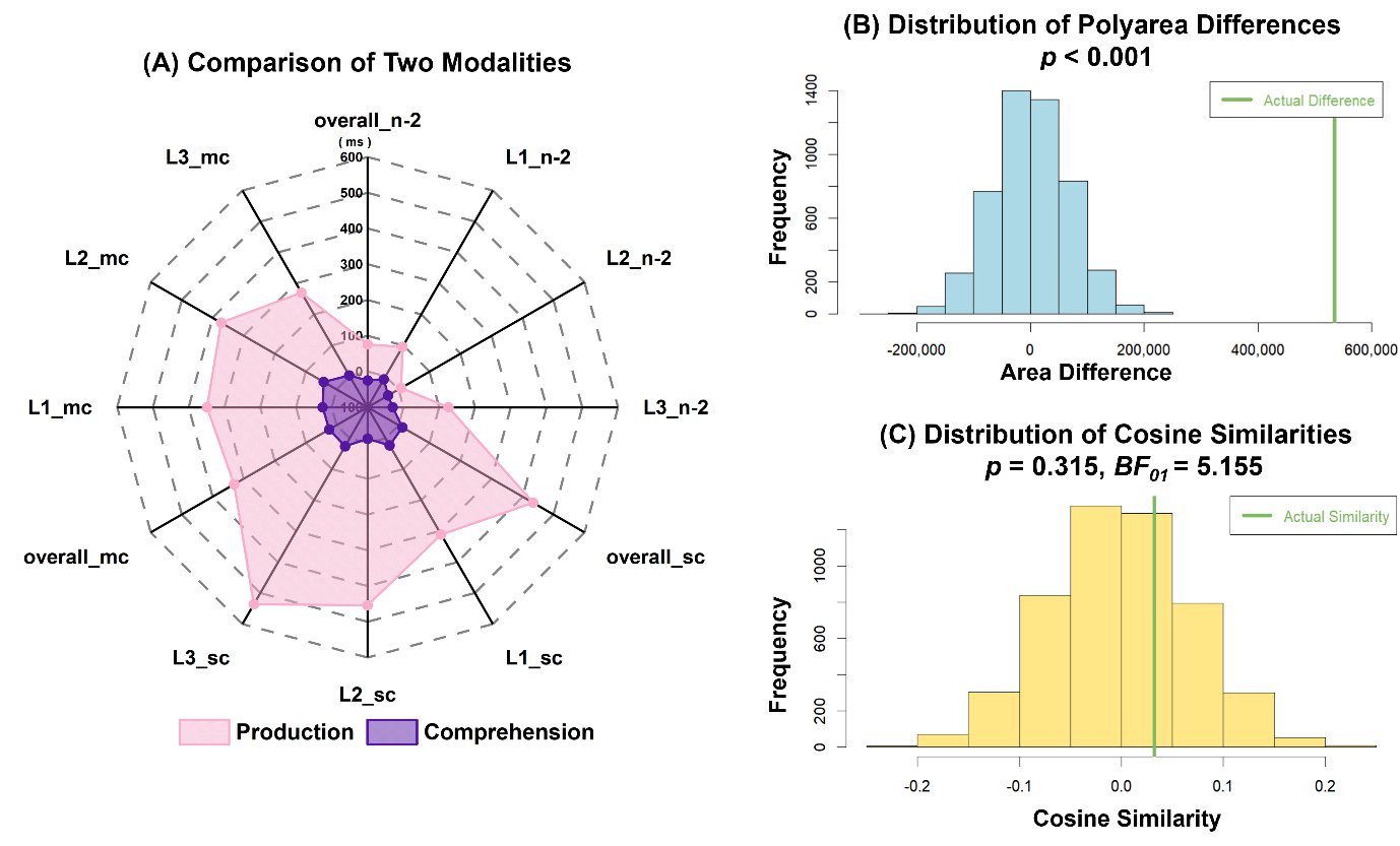 研究发现,在口语产出中,三项语言控制指标(n-2重复代价、切换代价、混合代价)均显著;而在听觉理解中,仅混合代价达到显著水平。个体差异分析显示,口语产出与理解在三类代价上的表现无显著相关,贝叶斯统计进一步支持两者缺乏相关性。雷达图、余弦距离和置换检验结果表明,产出模态不仅在语言控制强度上显著高于理解模态,两者在控制机制的模式方面也存在本质区别。