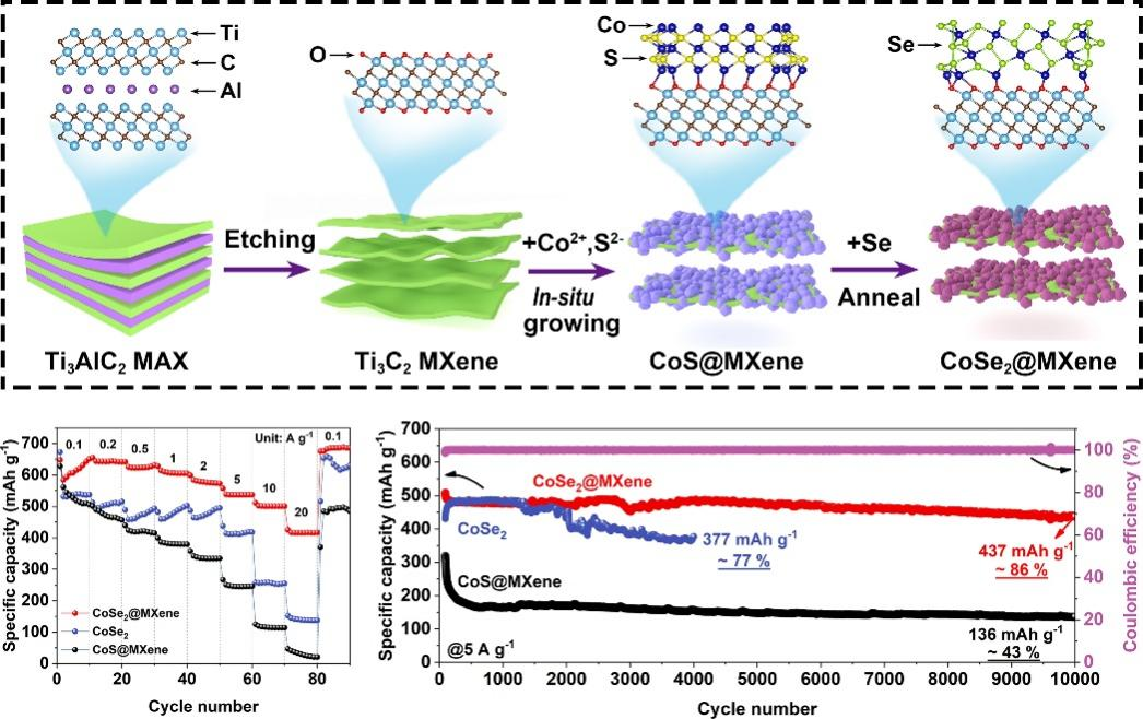 图 CoSe2@MXene复合材料的合成示意图和电化学性能图
