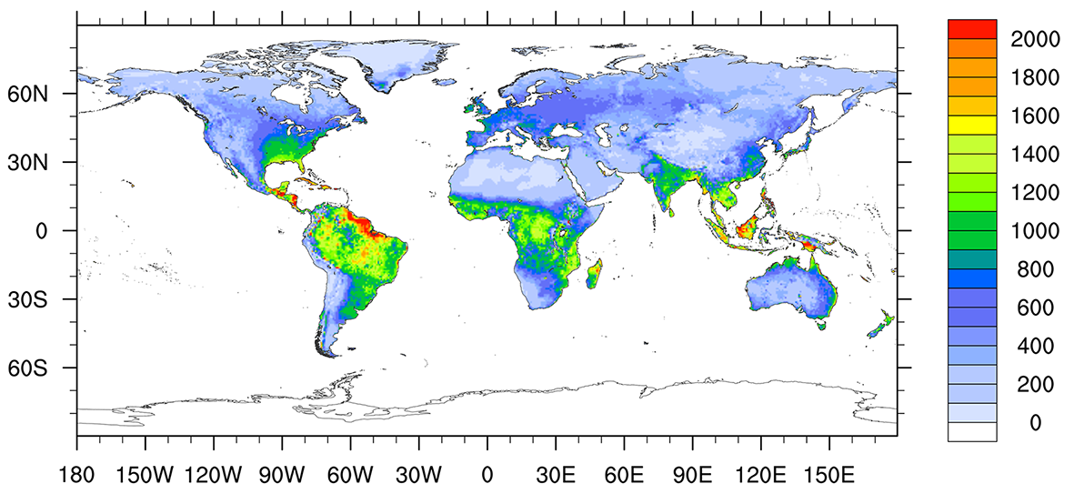 基于大气水量平衡的全球陆地蒸散发多年均值空间分布(单位:mm year-1)