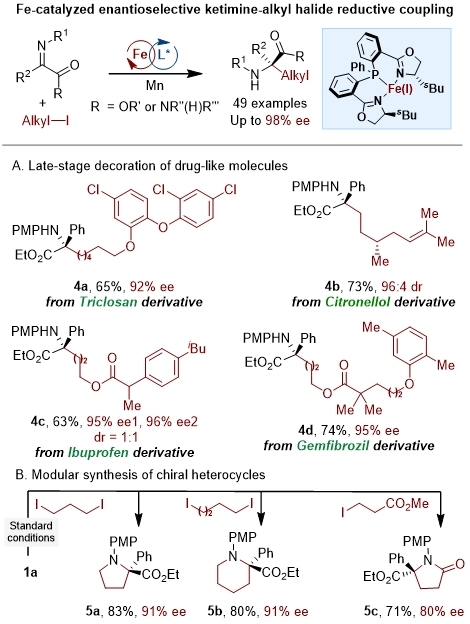图. 铁催化亚胺与烷基碘的不对称还原偶联及药物修饰