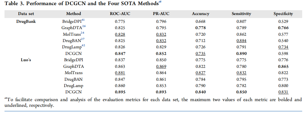 在两个公共数据集上的实验结果表明,DCGCN在整体性能上优于几种先进的DTI预测方法。这一优越性可归因于三维分子结构比线性结构更全面地反映和定义分子的特性。消融实验的结果表明,三维结构比线性结构提供了更有价值的见解。此外,DCGCN在冷启动设置下的优越性能进一步验证了其在识别新药物和靶标新用途方面的有效性。
