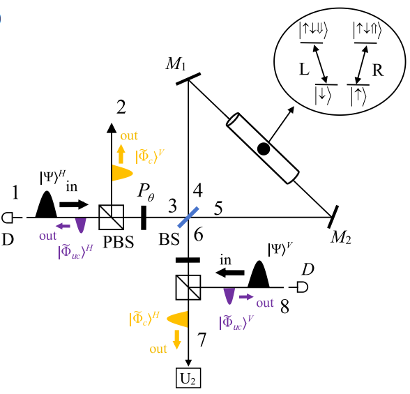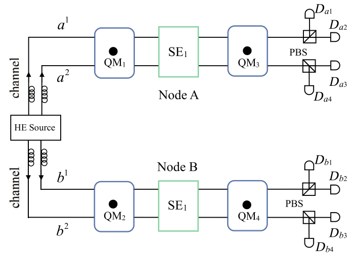 量子计算以其卓越的性能,已成为前景广阔的前沿领域。其中,量子纠缠作为特有的物理现象,是实现非局域计算的核心资源。无论是大规模量子通信,还是分布式量子计算,其实现都离不开一个关键环节:在量子网络的远距离节点间建立纠缠。因此,实现长程纠缠,是构建可靠量子网络、实现高效信息传输的基石。面向长距离量子计算与信息传输的实际应用,多自由度纠缠(超纠缠)技术的价值日益凸显。它不仅能增加量子通信的信道容量、优化资源利用效率,而且赋予了系统更强的抗噪声能力。这一切最终转化为量子计算系统更佳的稳定性与更强的实用性,为构建可靠的大规模量子网络奠定了坚实基础。因此,我们提出利用空间-偏振超纠缠作为纠缠光子源,用于实现位于两个遥远节点的多对量子存储器的并行纠缠。当一对超纠缠光子被分配到两个远程节点时,每个光子都会与所在节点的固态量子比特相互作用,从而在多个非局域量子力学系统对之间建立纠缠。需要说明的是,我们的纠缠方案包含两种不同的预报机制。首先,通过在量子存储器模块内的特定端口部署单光子探测器,可实时对输出光子的偏振态进行探测。如果单光子探测器响应,就说明量子存储器模块中发生了错误的散射事件。其次,置于每个节点末端的单光子探测器的响应能够有效区分多对量子存储器之间纠缠态的直积态。通过对系统参数的精准设置,即使是在千米距离的节点间,我们纠缠方案的成功率和保真度依旧表现良好。该纠缠方案可为构建大规模量子网络和长距离量子通信提供理论基础。